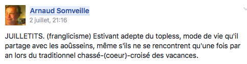 JUILLETITS. (franglicisme) Estivant adepte du topless, mode de vie qu'il partage avec les aoûsseins, même s'ils ne se rencontrent qu'une fois par an lors du traditionnel chassé-(coeur)-croisé des vacances.